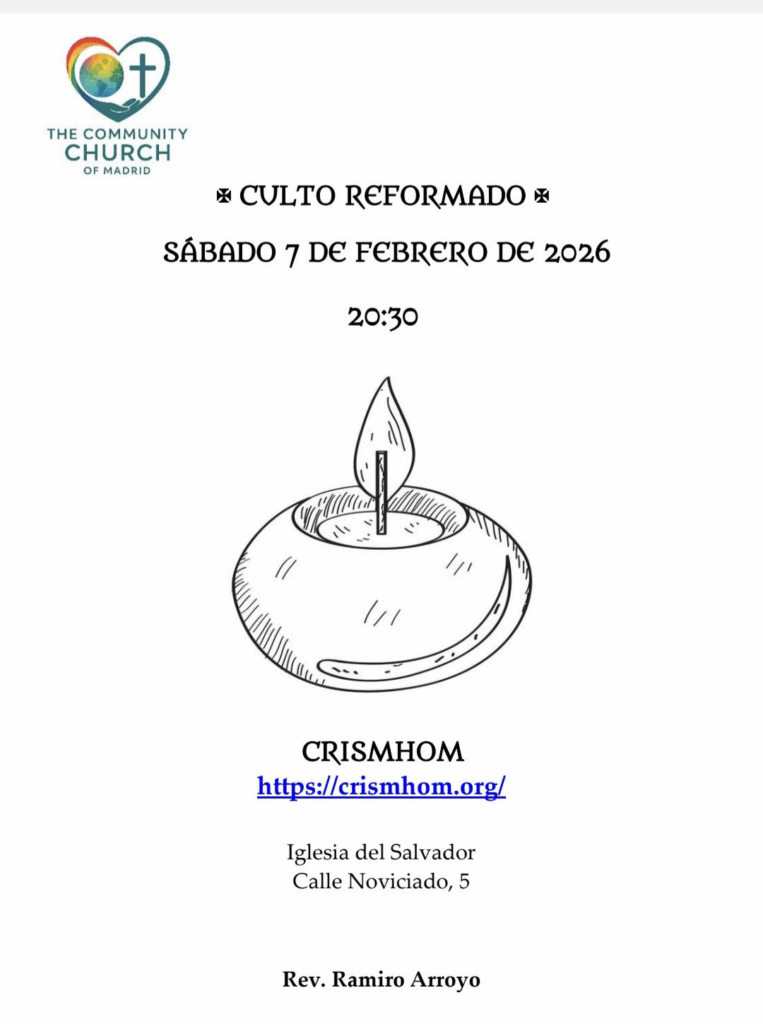 En este sábado 7 de febrero os invitamos a participar de la CELEBRACIÓN DE LA SANTA CENA, dentro de nuestro encuentro mensual del CULTO DE IGLESIAS REFORMADAS. El día de hoy presidirá el culto el pastor luterano Ramiro Arroyo