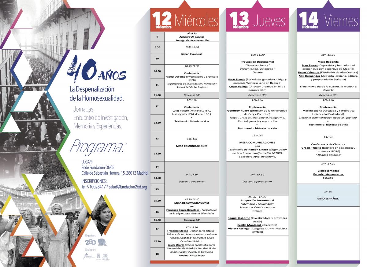 La Fundación 26 de Diciembre junto con la asociación Memorias en Red organizan durante los días 12, 13, 14 de Diciembre las jornadas «40 años: La despenalización de la homosexualidad» en la sede social de la ONCE (Calle Sebastián Herrera nº 15, Madrid).