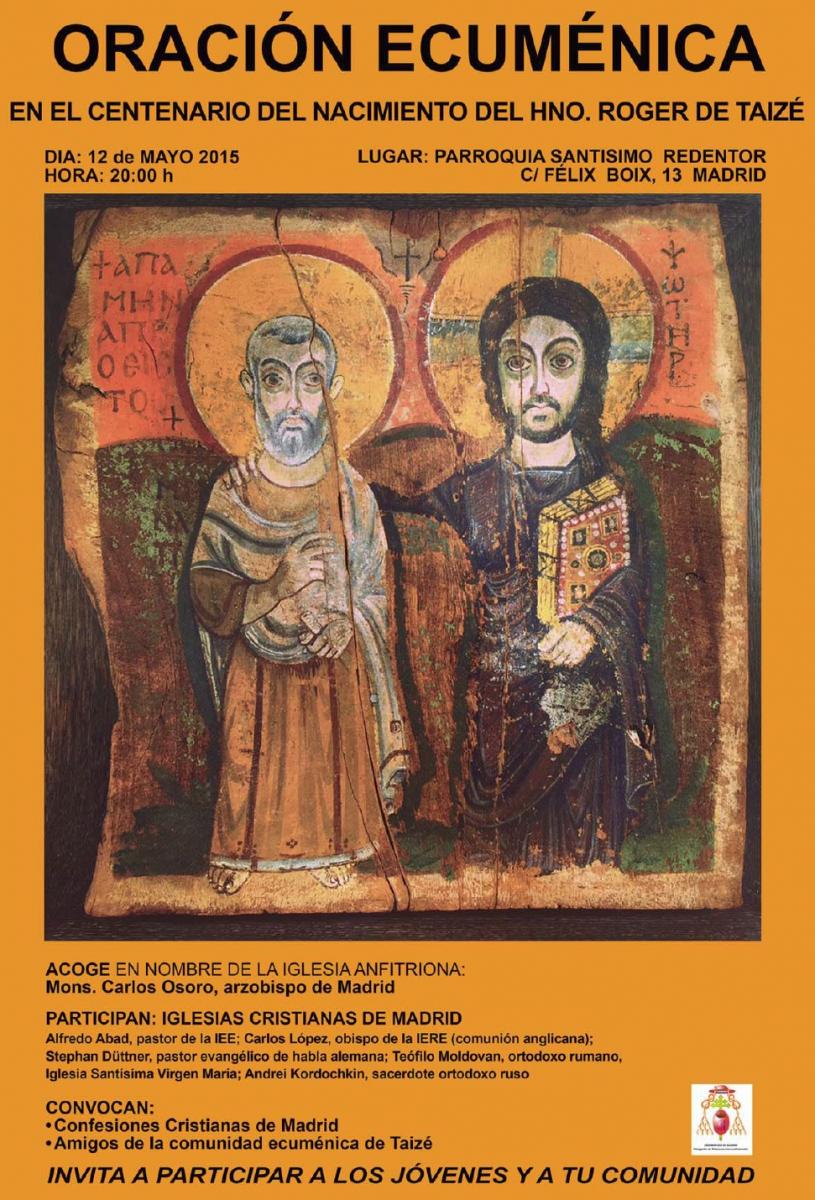 El martes 12 de mayo de 2015 a las 20h en la Parroquia del Santísimo Redentor (calle Félix Boix 13, 28036 Madrid), tendrá lugar una oración ecuménica en conmemoración del primer centenario del nacimiento del Hermano Roger de Taizé (Taizé es uno de los referentes más importantes del ecumenismo en Europa). El acto contará con la presencia de del arzobispo de Madrid, Monseñor Carlos Osoro, acogiendo en nombre de la iglesia anfitriona y representantes de las Iglesias cristianas de Madrid: Alfredo Abad (pastor de la Iglesia Evangélica Española), Carlos López (obispo de la Iglesia Española Reformada Episcopal de comunión anglicana), Stephan Düttner (pastor evangélico de habla alemana), Teófilo Moldovan (ortodoxo rumano de la Iglesia Santísima Virgen María), Andrei Kordochkin (sacerdote ortodoxo ruso). El acto está convocado por Confesiones Cristianas de Madrid y Amigos de la Comunidad Ecuménica de Taizé. Todo el mundo está invitado a participar.