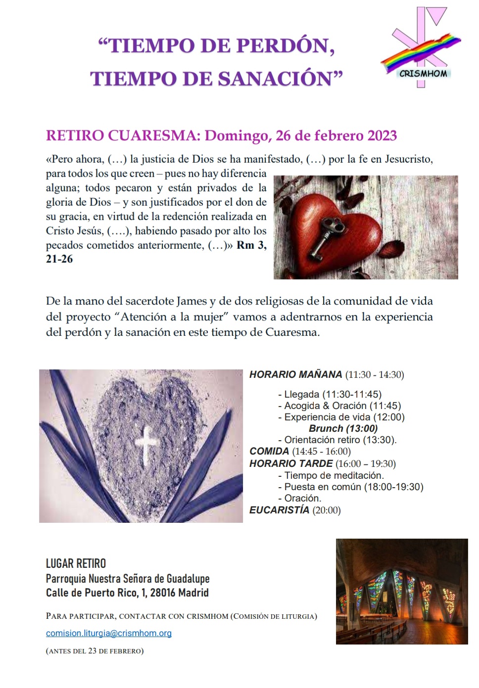 RETIRO CUARESMA – CRISMHOM «Tiempo para revivir en el amor» HORARIO DEL DÍA DE RETIRO HORARIO MAÑANA – Llegada (10:00-10:20) – Acogida & Oración (10:30) – Plática, oración y meditación (11:00) – Contemplación ignaciana y aplicación de sentidos (13:15) COMIDA y TIEMPO LIBRE (14:30 – 16:00) HORARIO TARDE – Experiencias de vida (16:15) – …