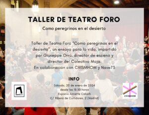 Taller de Teatro Foro, tipo de teatro en el que interviene y decide el público. En este taller, se representarán temas que preocupan a CRISMHOM, dado que es un teatro del oprimido. Ésta es la razón del título, que designa la situación de nuestra comunidad: Como peregrinos en el desierto.